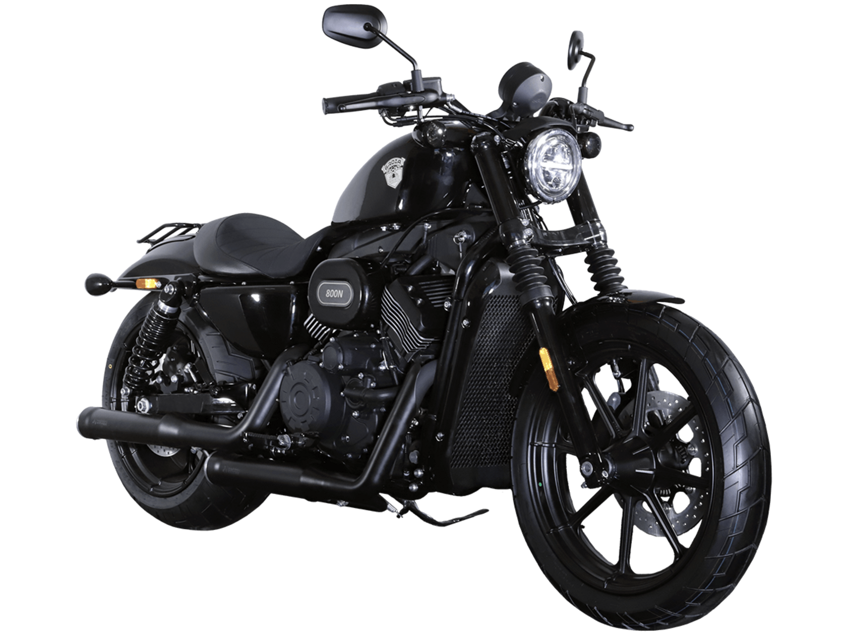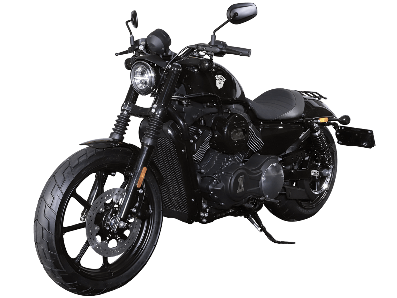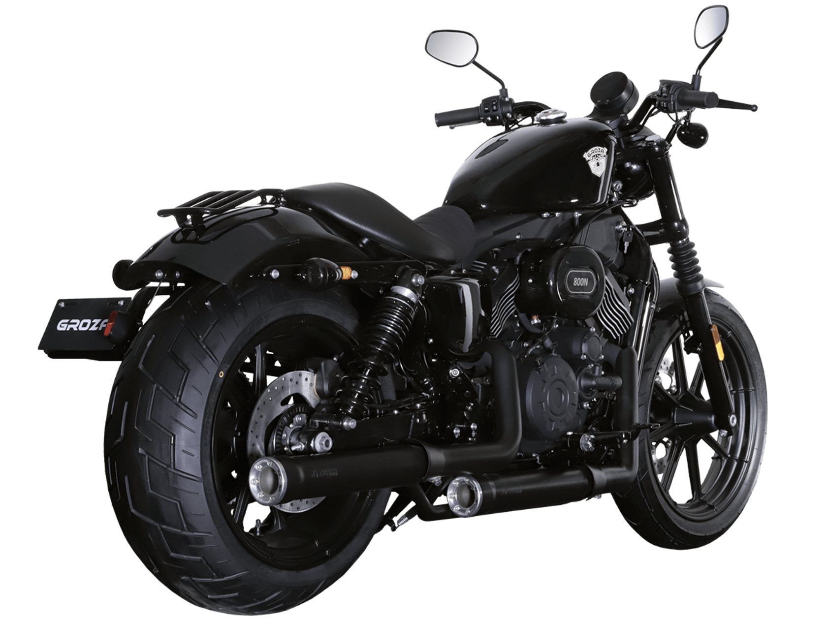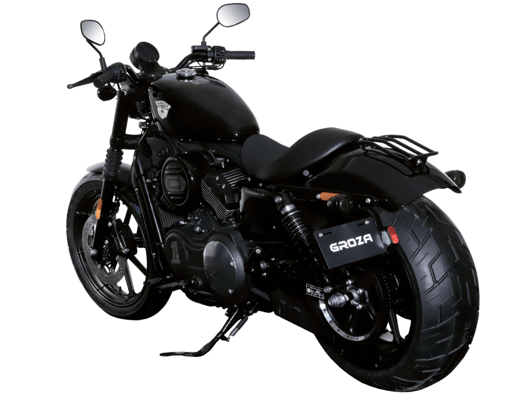 GROZA Toughman 800 – суровый и брутальный круизёр, который сразу обращает на себя внимание в потоке своей схожестью с кастом-байком: спартанской простотой с монохромной гаммой, олдскульными элементами, изящно оформленным двигателем, великолепной выхлопной системой и широченной задней покрышкой.Двухцилиндровый V-образный двигатель объёмом 800 см3 мощностью 61 л.с. при высоких показателях динамики и отличном крутящем моменте способен разгонять аппарат до 160 км/ч. Инжекторный впрыск топлива с инжектором DELPHI увеличивает топливную экономичность, а также позволяет добиться высокой приёмистости и неприхотливости агрегата. Привод на ведущее колесо осуществляется ремнём знаменитой марки USA Gates. Жидкостная система охлаждения не допустит перегрева мотора даже при самом агрессивном вождении.Аппарат имеет 6-ступенчатую механическую коробку передач с классической схемой “1-N-2-3-4-5-6”. На мотоцикл установлены литые алюминиевые диски диаметром 19 дюймов спереди и 17 дюймов сзади. Ширина передней покрышки – 130 мм, задней – целых 240 мм! С неровностями дороги эффективно справляются телескопическая вилка спереди и маятник с двумя газонаполненными амортизаторами сзади. Эффективное и безопасное замедление с любых скоростей обеспечивают гидравлические дисковые тормоза спереди и сзади.Байк обладает внушительным дорожным просветом 160 мм, что позволяет, при желании, съезжать на дороги с худшим покрытием, нежели асфальт. Зеркала не выходят за габариты руля, что позволяет комфортно проезжать на нём в междурядье.Мотоцикл сочетает в себе отличные технические характеристики, комфорт и надёжность, что позволяет вам ощутить настоящую свободу на любой дороге.