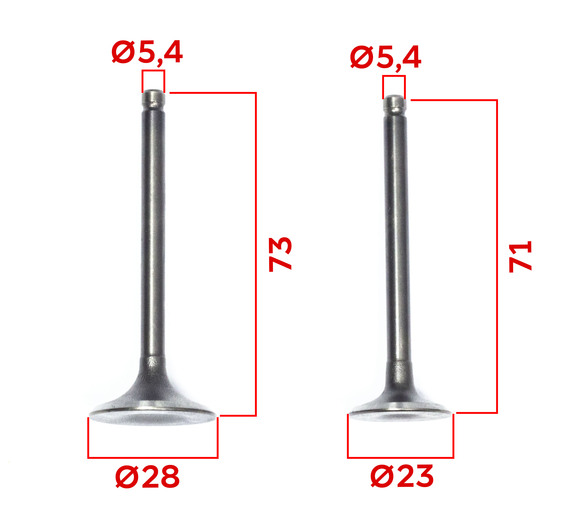 Подходит для :YX150/160, ZS155/160, YX150E.Размеры согласно схеме:A (Длина выпускной) = 71 мм, (впускной) = 73 мм B (Диаметр тарелки впускной) 28 мм, (выпускной) = 23 ммC (Диаметр ножки) = 5 мм