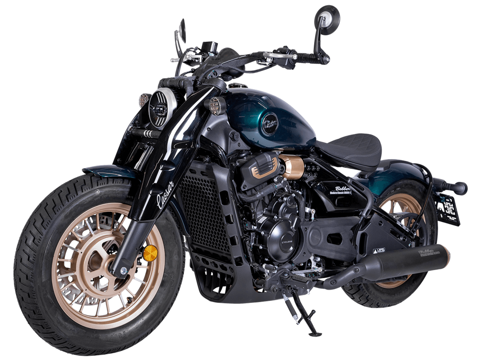 Мотоцикл CYCLONE RA600 Bobber – одноместный круизёр, готовый рассекать по городу и скоростным трассам. Лёгкая в управлении и надёжная модель с 550-кубовым двигателем, имеющая комфортный расход топлива для ежедневных поездок, хороший запас хода и оптимальную длину передач для маневрирования в потоке.Мотоцикл оснащён 2-цилиндровым 4-тактным двигателем ZS550SR жидкостного охлаждения с 4 клапанами на каждом цилиндре и 2 распредвалами. Двигатель имеет объём 550 см³ и способен обеспечить мощность в 59 л.с. при 8500 об/мин. Максимальный крутящий момент в 55 Нм достигается при 6500 об/мин. Подачу топлива обеспечивает инжектор BOSCH. Механическая коробка передач имеет 6 ступеней и схему 1-N-2-3-4-5-6.Максимальная скорость 165 км/ч.Объём топливного бака 14,5 литра.Колёса с легосплавными дисками имеют диаметр 16 дюймов. В качестве подвески используются телескопическая вилка и регулируемый маятник с моноамортизатором. Мотоцикл оснащён датчиками давления в шинах, показатели от которых выводятся на приборную панель. Клиренс в 150 мм позволяет комфортно проходить препятствия на дороге.Тормозная система произведена компанией J.JUAN, входящей в холдинг BREMBO. На оба колеса установлены гидравлические дисковые тормоза. Спереди установлен 2-поршневой суппорт, сзади используется однопоршневой суппорт с плавающей скобой. Дополнительную безопасность обеспечивают системы ABS и TCS. Они повышают устойчивость при экстренном торможении и на сложных поверхностях.Габариты модели 2190х855х1115 мм, снаряженная масса 198 кг. Высота по седлу 725 мм, колёсная база 1510 мм. Мотоцикл оснащён USB-портом для зарядки устройств