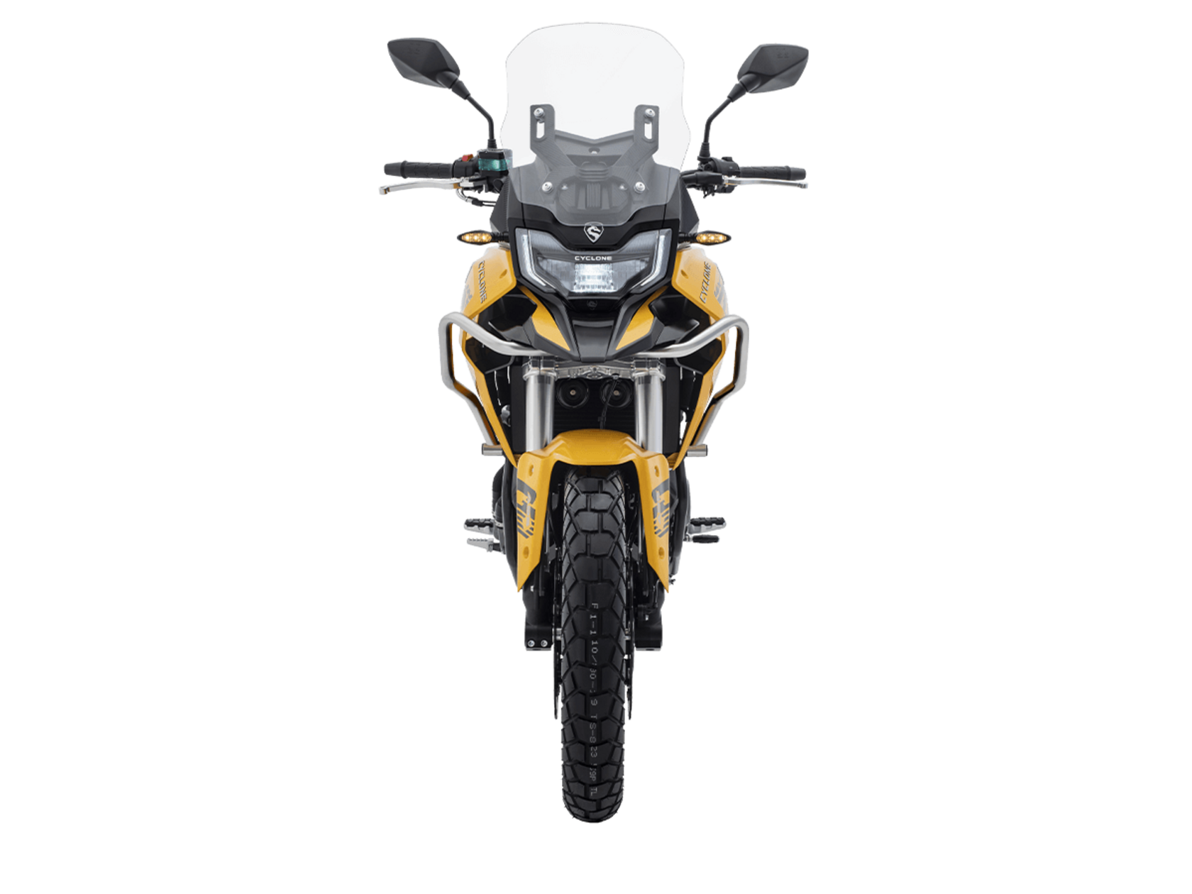 Мотоцикл CYCLONE RX401 2025 – туристический эндуро, готовый бросить вызов любым дорогам и расстояниям. За его рулём для вас не будет невозможных маршрутов!Оснащён рядным 2-цилиндровым 4-тактным двигателем DOHC объёмом 401 см³ с 4 клапанами на каждом цилиндре. Двигатель способен обеспечить мощность в 42,8 л.с. при 9500 об/мин, а максимальный крутящий момент 37 Н·м достигается на 8000 об/мин. Соотношение диаметра цилиндра и хода поршня 68х55,2 мм. Степень сжатия 11,6:1.Жидкостная система охлаждения не допустит перегрева двигателя даже при самом агрессивном вождении. Механическая коробка передач имеет 6 ступеней со схемой 1-N-2-3-4-5-6. Объём топливного бака 20 литров.Максимальная скорость мотоцикла 139 км/ч.Мотоцикл оснащён спицованными алюминиевыми колёсами диаметром 19 дюймов спереди и 17 сзади. Колёса обуты в бескамерные покрышки CST. В качестве передней подвески используется телескопическая вилка перевёрнутого типа, а сзади установлен маятник с моноамортизатором. Ход передней подвески 130 мм, задней – 55 мм. Оба компонента подвески регулируются. Для эффективного торможения используются гидравлические дисковые тормоза с 2-канальной ABS системой. Тормоза спереди представлены 2 тормозными дисками диаметром 305 мм с 4-поршневыми саппортами, а сзади расположен тормозной диск 258 мм с однопоршневым суппортом с плавающей скобой.Мотоцикл имеет продуманную конструкцию с высоко расположенным радиатором.Для освещения и сигнальных огней используется диодная светотехника. Данные от бортового компьютера выводятся на яркий цветной дисплей, оснащённый специальным козырьком для защиты от брызг и бликов. Имеются подсветка пультов, USB-порт, 12-вольтная розетка.Габариты 2160x860x1395 мм, снаряжённая масса 215 кг. Колёсная база 1410 мм, клиренс 185 мм, высота по седлу 810 мм.
