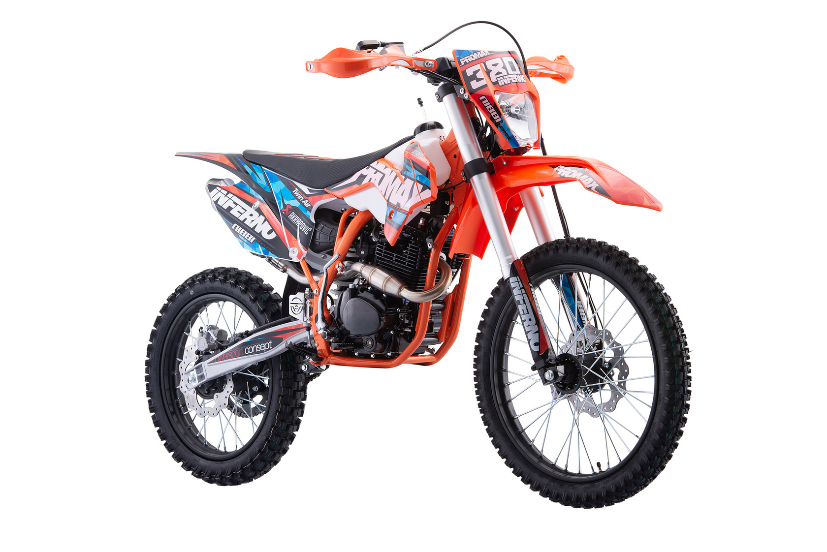 Главная ... Мотоциклы внедорожные Кроссовый мотоцикл PROMAX INFERNO 380 (4 valves, 5 gears) оранжево - черный-голубой