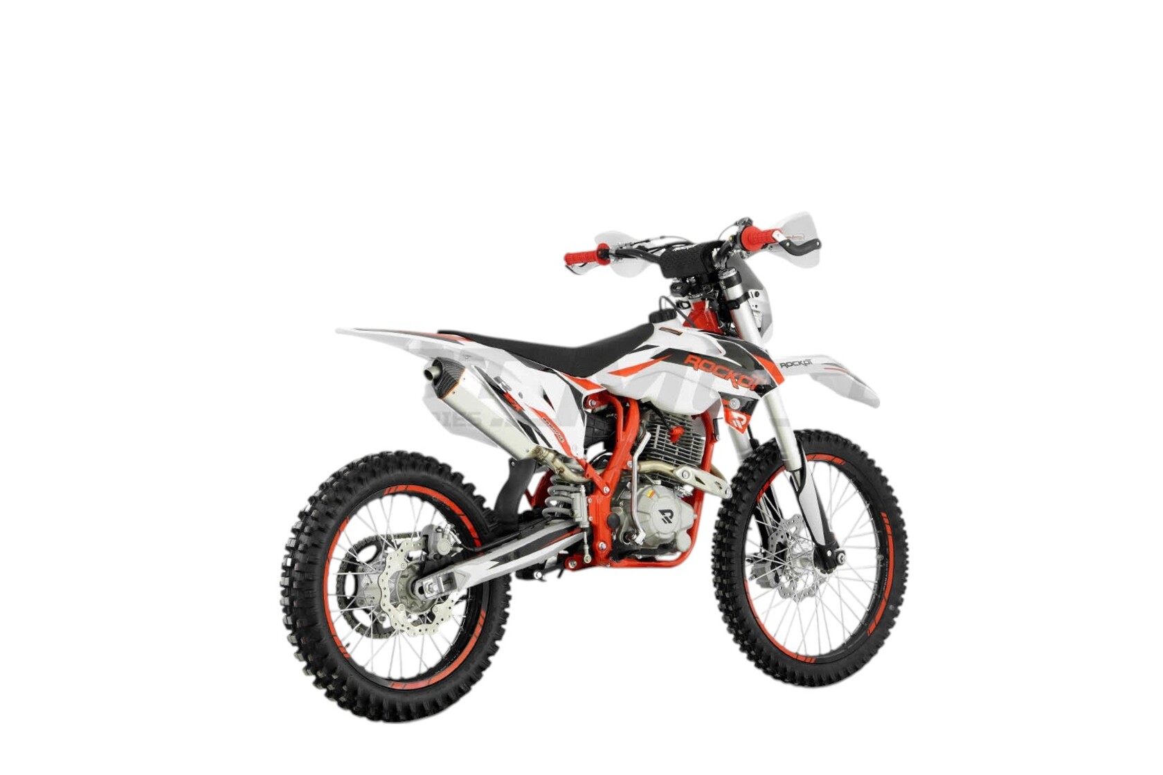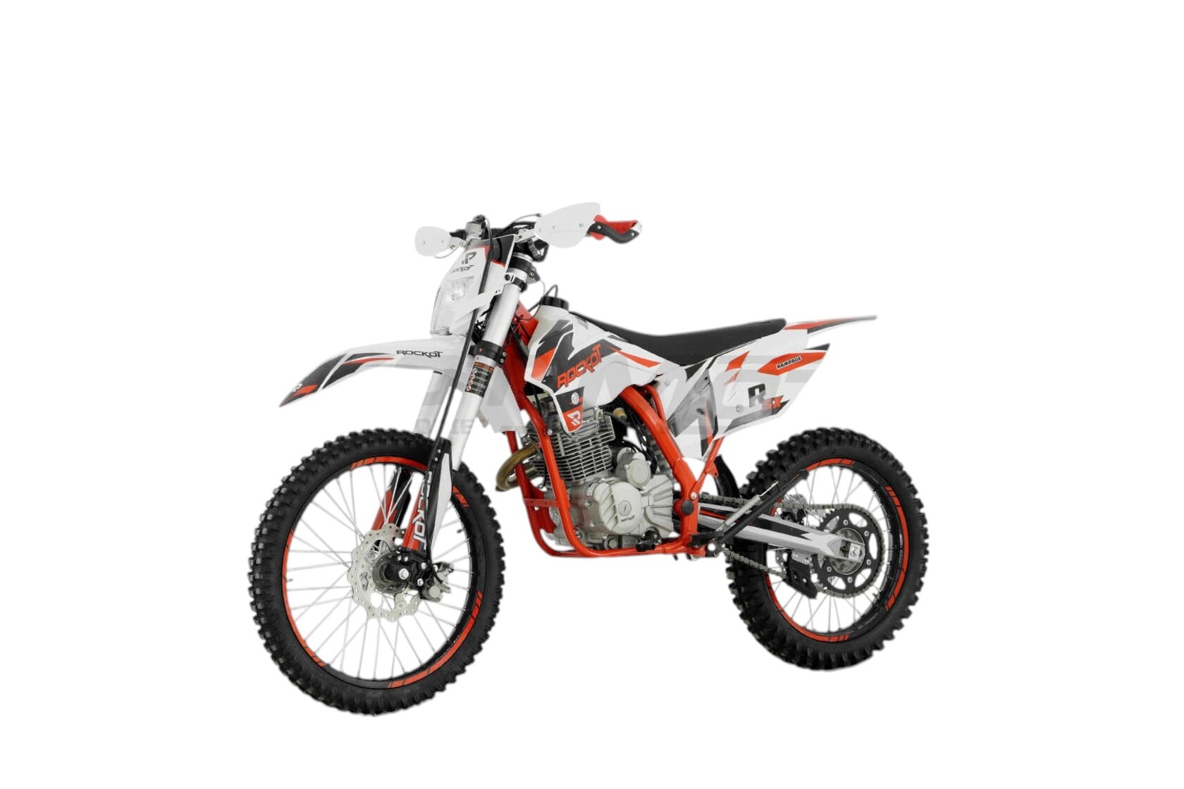 ROCKOT R5X Rampage - среднеразмерный эндуро мотоцикл, являющийся продолжением линейки R Series мотоциклов марки ROCKOT. Байк создан на базе уже “народных” мотоциклов ROCKOT R5F Raptor и R5 Cyclone.Обращаясь к дизайну мотоцикла, видно, что он построен на основе трех цветов: белого, красного и черного, сочетание которых подчеркивает его качества и представляет перед нами легкий, мощный и надежный эндуро мотоцикл.Белый пластик в стиле КТМ15 оклеен в прочную пленку с графикой в основных цветах модели. Рама мотоцикла окрашена в яркий красный цвет, что визуально придает байку свой спортивный характер. На ободах черных алюминиевых дисков нанесены защитные наклейки красного цвета. Все остальные элементы, такие как двигатель, маятник, передние и задний амортизаторы, глушитель окрашены в серебристый цвет, что также придает визуальную легкость байку. ROCKOT R5X Rampage имеет самый большой и мощный двигатель из возможных в линейке R - 175FMN CB250 от завода Zonsen (в 2023 году компания Zongshen провела ребрендинг и сменила имя), мощностью 24 лошадиные силы. Фактически, это тот же народный 172-ой, но с увеличенным цилиндром (Big Bore) на 271 см³.Данная модель двигателя славится своей простотой и надежностью, что и позволило ему стать самым популярным двигателем для эндуро мотоциклов.Коробка передач - пятиступенчатая, с многодисковым сцеплением в масляной ванне. Двигатель оснащен электростартером, но и кик-стартер остался на месте, ведь для использования мотоцикла в эндуро это очень важно.Выхлопная система выполнена из нержавеющей стали (приемная труба) и алюминиевого глушителя.За образование и подачу топливной смеси отвечает карбюратор PE28, чья конструкция также проста и надежна, как и сам двигатель. Эндуро мотоцикл ROCKOT R5X построен на среднеразмерной раме типа “К5” из хром-молибденового сплава стали, что дает ей высокую прочность и малый вес. Геометрия рамы обеспечивает высокий уровень управляемости и маневренности, а также стабильность на высокой скорости, несмотря на короткую базу в 1350 мм. Подвеска является одним из важнейших элементов эндуро мотоцикла. Поэтому здесь установлена длинноходная вилка спереди и моноамортизатор с системой рычагов прогрессии сзади. Длина передних амортизаторов составляет 830 мм, а толщина их рабочих штоков - 37 мм, что уже является золотым стандартом для эндуро мотоциклов среднеразмерной компановки. Задний моноамортизатор имеет регулировку скорости отбоя и преднатяжения пружины.Спереди и сзади установлены гидравлические тормозные механизмы. Спереди: тормозной диск диаметром 270мм и двухпоршневой суппорт. Сзади: тормозной диск диаметром 240 мм и однопоршневой суппорт. Вся гидролиния переднего и заднего тормозов выполнена из армированных шлангов, что повышает производительность тормозной системы и делает ее более надежной.Колеса мотоцикла ROCKOT R5X Rampage имеют стандартную для эндуро формулу - 21/18. Передний и задний колесные диски произведены из алюминиевого сплава высокой прочности. С завода мотоцикл комплектуется кроссовыми шинами размерностью 80:100-21 спереди и 110:90-18 сзади. На заднем колесе установлена ведомая приводная звезда на 47 зубьев под 520-ю цепь. Как настоящий спортивный снаряд, модель R5X Rampage оснащена только самым необходимым: яркая LED фара, руль переменного сечения (Fat Bar) 22/28, влагостойкие кнопки запуска и остановки двигателя, алюминиевые рычаги сцепления и 