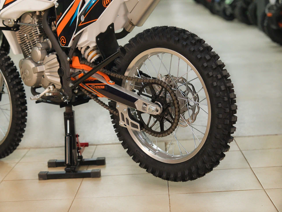 Мотоцикл KAYO K1 250 MX – “народная” версия внедорожного мотоцикла от компании KAYO. Идеальный снаряд для внедорожного экстрима, представляющий собой оптимальный баланс производительности и технической оснащённости, поэтому он идеально подходит как новичкам, так и опытным райдерам. Удобный, простой и надёжный мотоцикл, который полностью оправдывает свою цену.Мотоцикл оснащён одноцилиндровым 4-тактным двигателем воздушного охлаждения (ZONGSHEN ZS172FMM) объёмом 249 см3, который обеспечивает высокую мощность (21 л.с.) и крутящий момент, что позволяет развивать большую скорость и с лёгкостью преодолевать трассы со сложным рельефом. Карбюраторная система подачи топлива с карбюратором NIBBI PE30 обеспечивает бесперебойную работу техники в самых жёстких условиях эксплуатации, простоту и лёгкость в обслуживании, а также неприхотливость к качеству топлива. Аппарат оснащён 5-ступенчатой механической коробкой передач с классической схемой “1-N-2-3-4-5”.Усиленная рама из хром-молибденового сплава и подвеска позволяют эффективно амортизировать удары при езде по неровностям и препятствиям на трассе. Передняя подвеска телескопическая вилка перевёрнутого типа от фирмы KKE длиной 800 мм, задняя — нерегулируемый моноамортизатор 360 мм, рассчитанный на высокие нагрузки до 900 LBS, также произведённый компанией KKE. Мотоцикл оснащён классическими спицованными колёсами диаметром 18 и 21 дюйм. Колёса имеют усиленные обода из алюминиевого сплава и буксаторы. Эффективное и безопасное замедление с любых скоростей обеспечивают гидравлические дисковые тормоза.Мотоцикл достаточно компактен и имеет вес всего в 105 кг, поэтому он комфортен в эксплуатации одновременно и для мужчин среднего телосложения, и для девушек. Аппарат оснащён системой запуска двигателя при помощи кнопки электростартера или при помощи рычага кик-стартера.Высококачественная износостойкая резина с развитым протектором отлично держит дорогу на различных типах покрытия и в самых разных поворотах. Сиденье эргономичной формы покрыто антискользящим материалом.K1 250 MX сочетает в себе отличные технические характеристики, комфорт и надёжность, что позволяет вам ощутить настоящую свободу на любой трассе