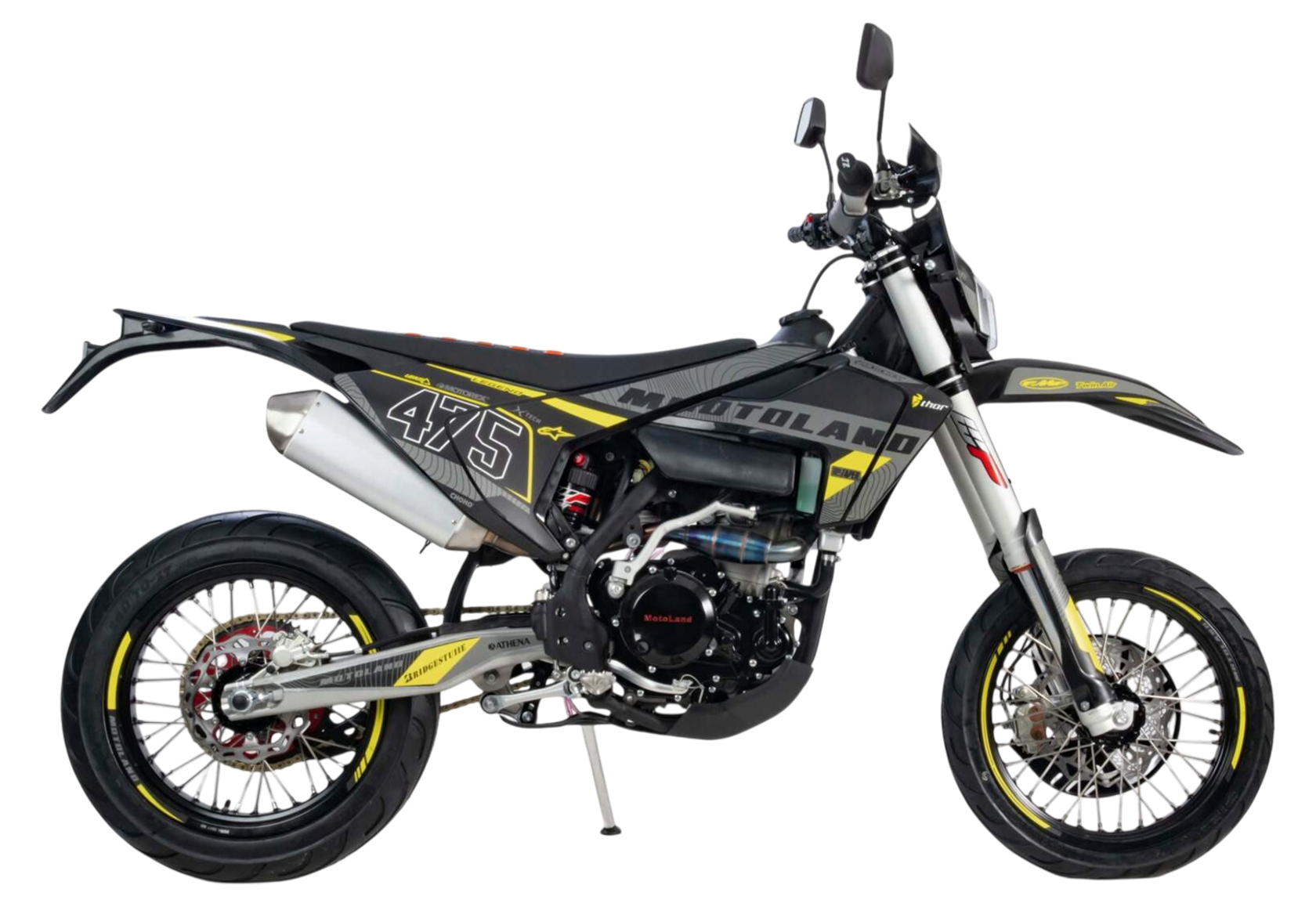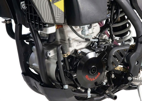 Мотоцикл MOTOLAND 500 XT500 ST 17/17 (мотард) это полноценный «заряженный» кроссовый мотоцикл, но на шоссейной резине. Имеет хорошую проходимость и тяговую мощность за счет установленного 4х тактного двигателя LONCIN 267 MR с рабочим объёмом 500 см³, мощностью 48 л.с. и карбюратором Nibbi 38. Идеален для езды по дорогам общественного пользования, т. к. его сликовые 17 дюймовые шины (110-70) и (140-70) просто созданы для езды по среднему и твердому грунту.Мотоцикл относится к топовой линейке мотоциклов MOTOLAND. Передняя подвеска FASTACE - картриджная(закрытого типа), обеспечивает лучшее качество демпфирования (лучше отрабатывает препятствия) по сравнению с обычными вилками, с зади так же установлен амортизатор FASTACE, с увеличенным выносным бачком, позволяющий настраивать подвеску под разные условия эксплуатации. Ступицы из фрезерованного алюминия обладают высоким сопротивлением к нагрузкам. Большое количество аллюминиевых деталей позволило значительно снизить его вес, который составляет всего 125 кг.
