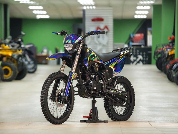 ДвигательДвигатель ZS165FMM - 4-тактный двигатель воздушного охлаждения объёмом 223 куб см с двумя клапанами, оснащён балансировочным валом, благодаря которому уменьшается избыточная вибрация, передаваемая от двигателя на раму и общую конструкцию техники. Характеризуется хорошей тягой с самых низов и лёгким пуском с помощью электростартера. Двигатель отлично зарекомендовал себя в качестве надёжного, универсального, неприхотливого мотора с хорошими характеристиками.РамаРама мотоцикла OXO производится из труб шестигранного сечения хром-молибденовой стали, которая является очень прочной и легкой. Геометрия рамы, благодаря правильно выверенному центру тяжести и углу наклона вилки - способствует наилучшей управляемости устойчивости мотоцикла на низкой скорости.ПодвескаПередняя вилка перевернутого типа. Мотоцикл снабжен моноамортизатором, который соединен посредством системы рычагов прогрессии. Система прогрессии, обеспечивает равномерную, мягкую работу и увеличивает длину рабочего хода подвески.КолесаРазмер передней покрышки: 80/100-21. Размер задней покрышки: 120/100-18. Они прекрасно себя ведут по песку и грязи, что позволяет райдеру отлично показать себя на пересеченной местности.Тормозная системаТормозная система мотоцикла - полностью гидравлическая с армированными шлангами. Спереди и сзади установлен двухпоршневой суппорт. Данная конфигурация тормозных механизмов, позволит быстро и безопасно остановиться с максимальной скорости даже на бездорожье.РульВажная часть современного эндуро мотоцикла - усиленный руль переменного сечения. На руле установлен рычаг заслонки подсоса. Алюминиевая ручка газа с коротким ходом имеет регулировку троса. Также мотоцикл укомплектован электронной панелью приборов..