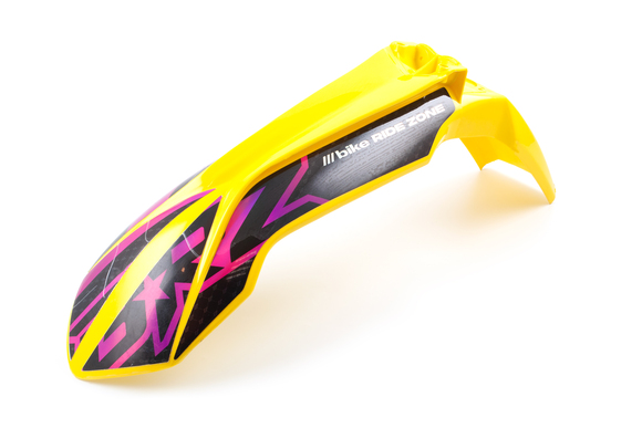 • Ярко-жёлтое переднее крыло с уникальными спортивными наклейками для мотоциклов KTM 2015-2016 года, а также совместимых моделей китайских эндуро на рамах K5, K7, K8. Крыло выполнено из прочного и эластичного пластика современного типа, повторяет форму и размеры оригинальной детали KTM (артикул 7770801000004), быстро и легко устанавливается на штатные места без доработок. Глянцевый жёлтый цвет с оригинальным графическим рисунком (крупные элементы розового, чёрного, надпись "bike RIDE ZONE") отлично выделяет мотоцикл среди других и подчёркивает индивидуальность.