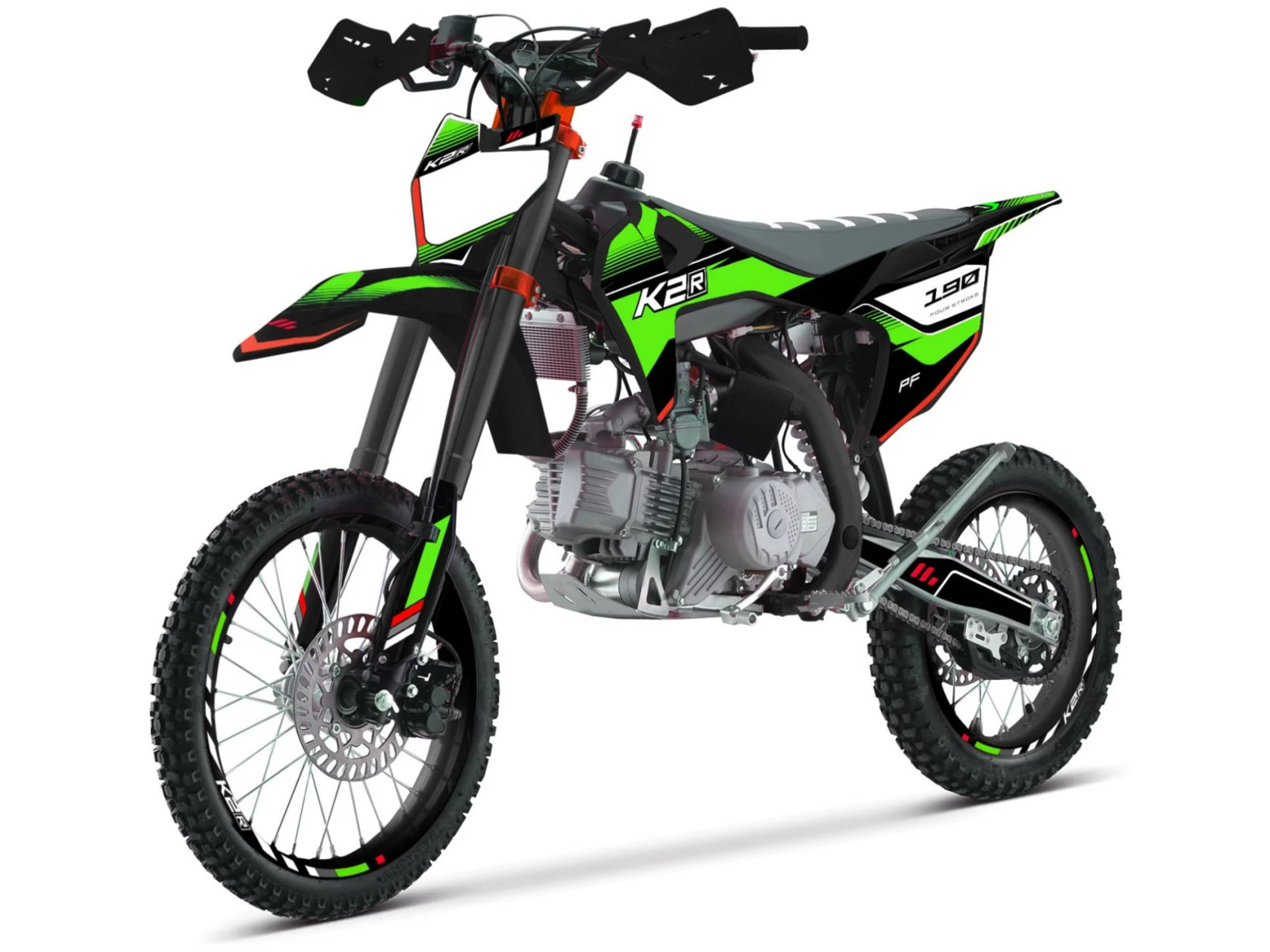K2R PF 190 - мощный спортивный питбайк «из коробки» готовый к участию в гонках.В раме питбайка установлен надежный 1-цилиндровый двигатель Zongshen, работающий с 5-ступенчатой КПП;17 и 14-дюймовые спицованные колеса;регулируемая перевернутая вилка;полностью регулируемый DNM амортизатор; высота сиденья составляет 845 миллиметров;дорожный просвет равен 320 мм.
