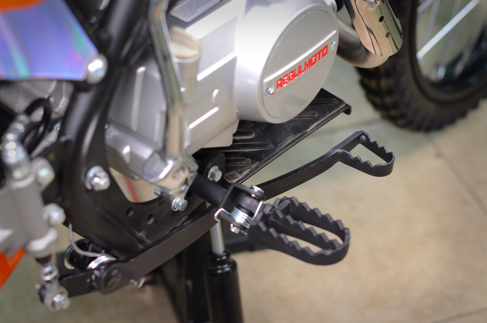 Regulmoto Pilot c электростартером и классической механической коробкой передач– питбайк начального уровня, созданный специалистами Американского мотобренда PitsterPro для юных мотогонщиков.Данная модель представляет линейку мототехники Regulmoto модельного ряда 2023 года, отличается высокой надежностью и простотой в эксплуатации.В прочной и надежной раме питбайка стоит 4х-тактный двигатель YX воздушного охлаждения с 4-ступенчатой классической механической трансмиссией.Высокий класс используемых комплектующих обеспечивают необходимый для внедорожной мототехники уровень надёжности и комфорта.Яркая светодиодная фара позволяет использовать питбайк также в тёмное время суток.В 2023 году Regulmoto Pilot получил ряд обновлений – кроме нового дизайна графики, изменения коснулись дизайна пластикового обвеса, подножек, рычагов тормоза, переключения передач и глушителя.Эта модель рассчитана на детей и подростков возрастом от 7 до 15 лет.Наличие классической механической трансмиссии позволяет детям и подросткам с минимальным опытом управления двухколесной мототехникой быстро освоить основы и совершенствовать навыки вождения на бездорожье.