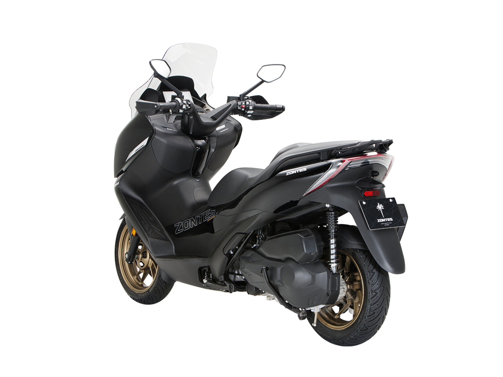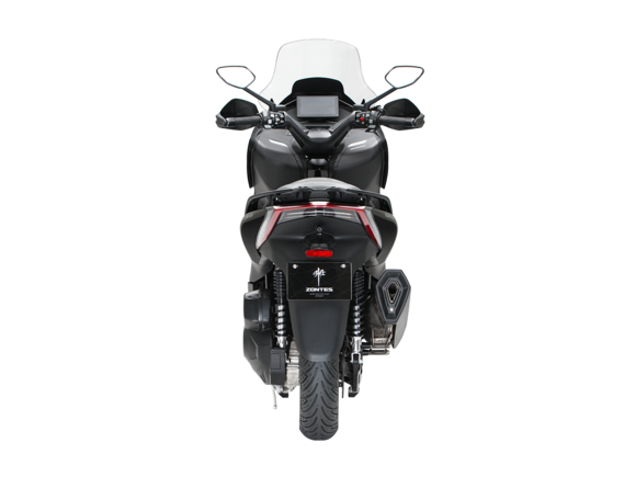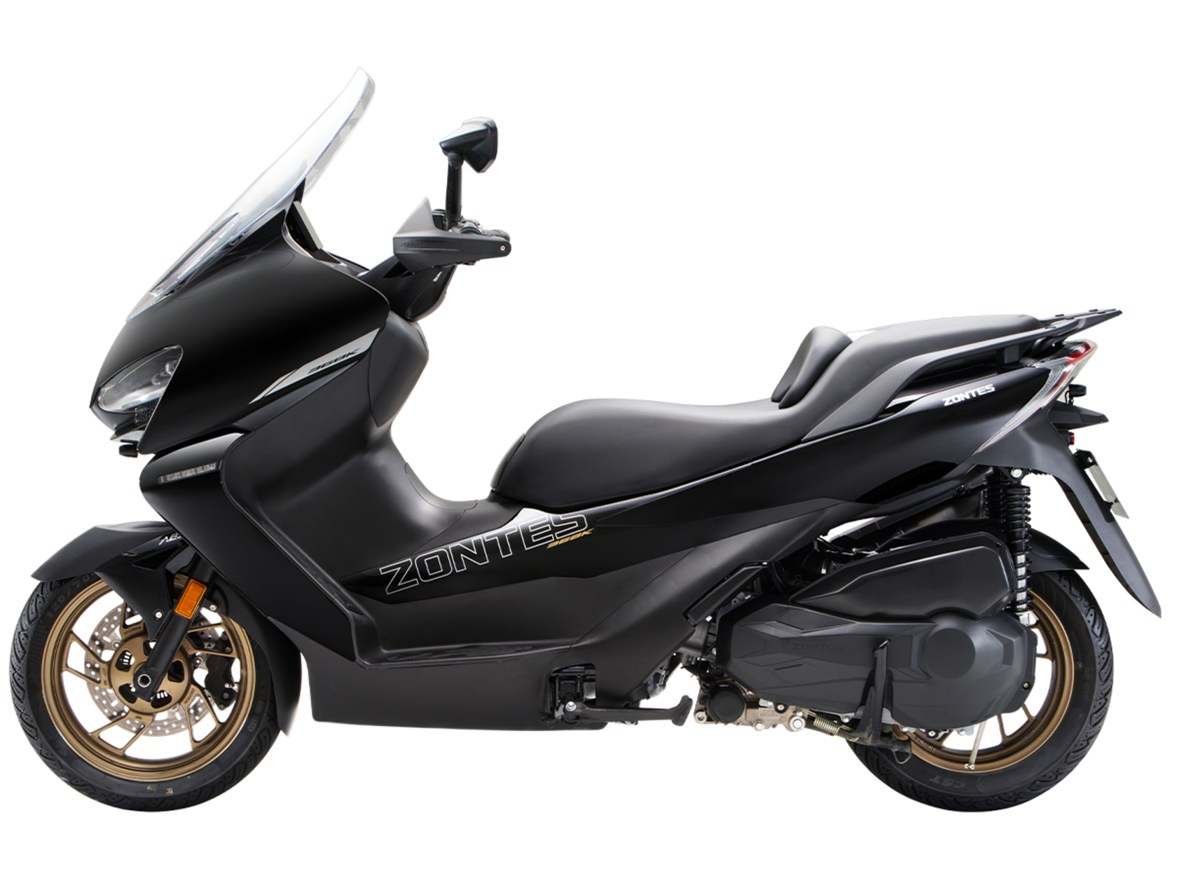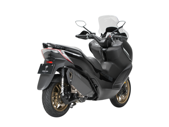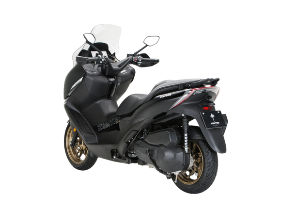 Скутер ZONTES ZT368-K – максискутер с богатым оснащением и строгим, стильным дизайном, готовый предложить максимум комфорта. В стоке имеет видеорегистратор, большой багажник и удобное сиденье со спинкой.Силовая установка представлена одноцилиндровым 4-тактным двигателем. Двигатель имеет объём 368 см³ и обеспечивает мощность в 38,8 л.с. Оснащён инжектором BOSCH, системой жидкостного охлаждения и вариатором. Запуск двигателя осуществляется с помощью бесключевого доступа.Ёмкость топливного бака 17 литров.Колёса имеют диаметр 15 дюймов спереди и 14 дюймов сзади. Для подвески спереди используется телескопическая вилка, а сзади установлены 2 амортизатора. Гидравлические дисковые тормоза произведены компанией J.JUAN, входящей в холдинг BREMBO. Мотоцикл также оснащён 2-канальной ABS-системой, противобуксовочной системой TCS System и датчиками давления в шинах.ZT350-K оборудован яркой LED-фарой, мультимедийной приборной панелью с TFT-дисплеем, имеются 2 USB-порта.Габариты скутера 2195х795х1395 мм. Колёсная база 1570 мм. Высота по седлу 770 мм. Вес 188 кг.