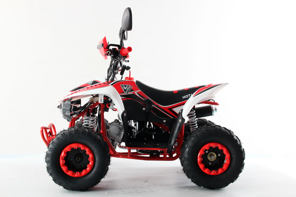 Квадроцикл бензиновый MOTAX MIKRO 110 компактный квадроцикл на больших колёсах для детей в возрасте от 5 лет.Оборудован 4-х тактным двигателем объёмом 110 куб. см., автоматической трансмиссией с передачей заднего хода. Базовая комплектация включает в себя: электростартер, яркие светодиодные фары, зеркала заднего вида, защита рук, спидометр, ножной гидравлический задний тормоз, тихий глушитель. Подростковый квадроцикл имеет современный и яркий дизайн, хорошую управляемость и маневренность.