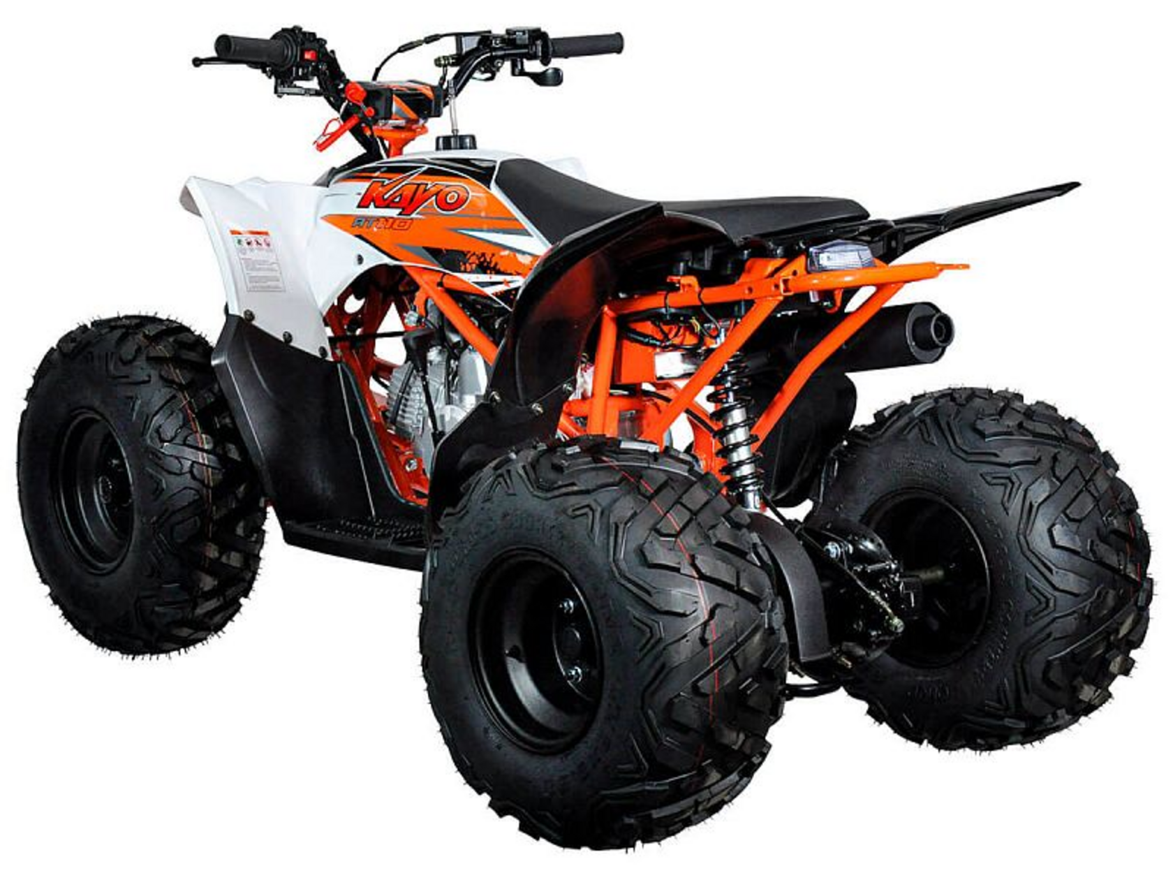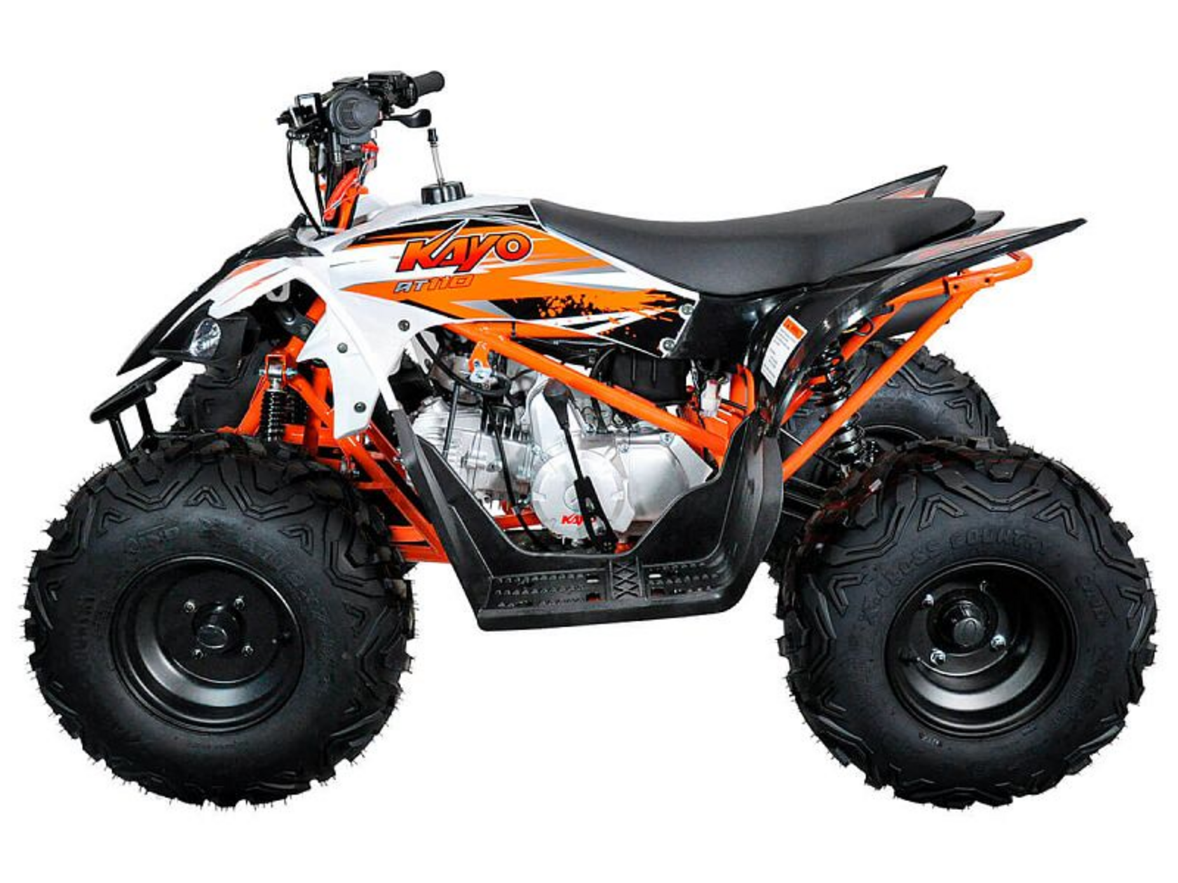 Представляем Вам надежный детский квадроцикл, выполненный в лучших традициях спортивных ATV. Вашему ребенку определенно понравится яркий и современный дизайн нового KAYO AT110. В целом, этот квадроцикл благодаря оптимальному сочетанию цены, мощности и качества, станет отличным вариантом в качестве первой техники для вашего ребенка.Модель AT110 оснащается 4-тактным двигателем KAYO с рабочим объемом в 110 куб. см. Вся мощность с помощью автоматической трансмиссии и цепного привода передается на заднюю ось. Квадроцикл очень прост и легок в управлении, поэтому у ребенка не возникнет проблем с освоением этой техники.Спереди используется двухрычажная подвеска. Сзади расположен моноамортизатор. Такая конфигурация может быть вам знакома по взрослым спортивным ATV. Тормоза гидравлические дисковые.На руле расположены все необходимые кнопки для управления функциями квадроцикла. Также здесь расположена кнопка аварийного выключения двигателя. Предусмотрен и ограничитель скорости.Квадроцикл Kayo AT110 построен на стальной трубчатой раме. Такая конструкция позволила сделать квадроцикл прочным и легким.