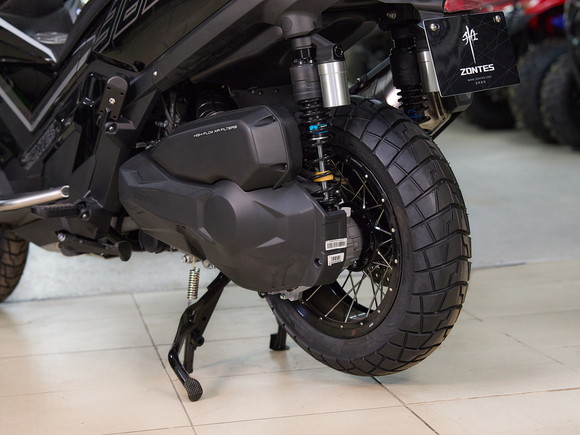Скутер ZONTES ZT368-G – максискутер двойного назначения, готовый пронестись по улицам города за его пределы и отправиться по грунтовым тропам прокладывать свой маршрут туда, куда вам потребуется. Регулируемая подвеска с перевёрнутой телескопической вилкой спереди обеспечит отличную управляемость и устойчивость в любых условиях.Силовая установка представлена одноцилиндровым 4-тактным двигателем. Двигатель имеет объём 368 см³ и обеспечивает мощность в 38,8 л.с. Оснащён инжектором BOSCH, системой жидкостного охлаждения и вариатором. Запуск двигателя осуществляется с помощью бесключевого доступа.Ёмкость топливного бака 17,5 литра.Колёса имеют диаметр 17 дюймов спереди и 14 дюймов сзади. Для подвески спереди используется телескопическая вилка перевёрнутого типа, а сзади установлены 2 гидравлических амортизатора. Гидравлические дисковые тормоза произведены компанией J.JUAN, входящей в холдинг BREMBO. Мотоцикл также оснащён 2-канальной ABS-системой, противобуксовочной системой TCS System и датчиками давления в шинах.ZT350-G оборудован яркой LED-фарой, мультимедийной приборной панелью с TFT-дисплеем, имеются 2 USB-порта.Габариты скутера 2230х925х1290 мм. Колёсная база 1560 мм. Высота по седлу 795 мм. Вес 198 кг.