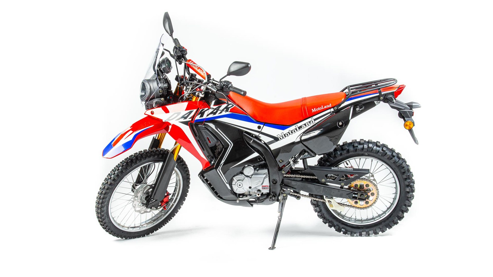Новинка 2020 года - Мотоцикл Motoland DAKAR 250 ST.Данный мотоцикл прост в управлении и неприхотлив в обслуживании и подходит мотолюбителям Эндуро любого возраста,и опыта вождения, которым нужна техника для поездок из точки А в точку Б и обратно по дорогам и легкому бездорожью.Motoland DAKAR 250 ST оснащен одноцилиндровым четырехтактным двигателем 172FMM мощностью 21 л. с. и объемом 250 см³ с воздушным охлаждением. Установлен карбюратор PZ 30 с ускорительным насосом увеличивает скорость разгона.Для запуска двигателя можно использовать электростартер или кикстартер.Механическая трансмиссия содержит 5 передач.Мотоцикл оснащен надежными передними и задними тормозами с двух поршневыми тормозными суппортами.Колёса спицованные, размер заднего колеса — 18 дюймов, переднего — 21 дюйм. Весит 120 кг, выдерживает нагрузку до 150 кг.У нас Вы можете купить этот мотоцикл с бесплатной доставкой по РФ и гарантией до года. Также его можно приобрести в рассрочку или в кредит.