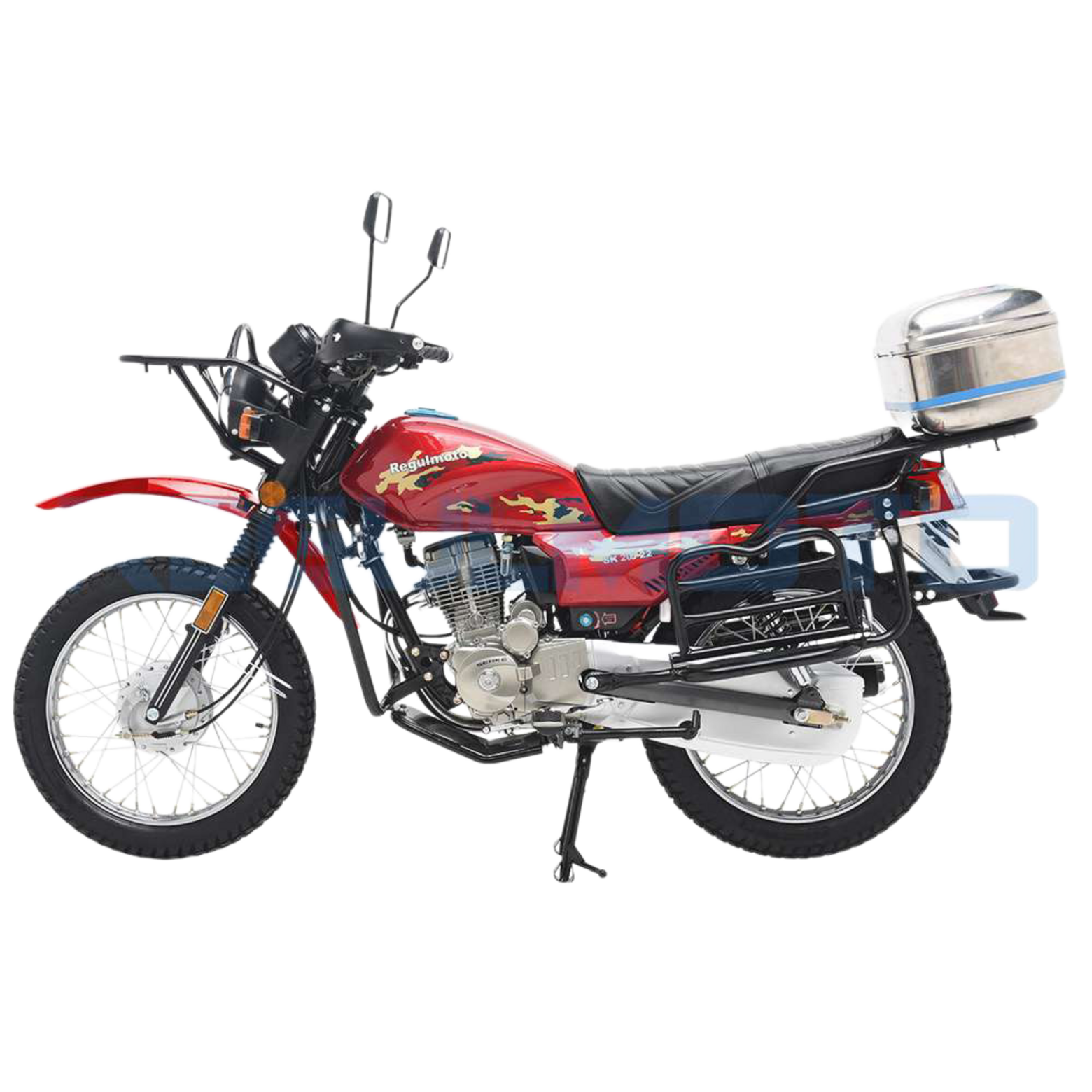Regulmoto SK200-22 – достойный представитель класса классических дорожных мотоциклов. Эта модель может быть использована в качестве надежного и экономичного средства передвижения по дорогам общего пользования и легкому бездорожью для решения широкого круга эксплуатационных задач.Данный мотоцикл разработан специалистами известной мотоциклетной компании SENKE и собирается на ее производственных мощностях. Благодаря высоким стандартам контроля качества продукция компании пользуется заслуженным признанием экспертов мотоиндустрии и поклонников двухколесного транспорта во многих странах мира.В раме Regulmoto SK200-22 устанавливается проверенный временем 4-тактный одноцилиндровый 200-«кубовый» двигатель с 5-ступенчатой коробкой передач и электростартером, работающий в паре с карбюратором. Средний расход топлива составляет меньше трех литров на сто километров пути. Подвеска представлена телескопической вилкой спереди и двумя амортизаторами сзади. Тормозная система мотоцикла базируется на классических барабанных тормозах в ступицах 18-дюйомвых колес.Мотоцикл в стоковой комплектации оснащается дугами безопасности, кожухом защиты цепи, защитой рук, защитой двигателя, центральной и боковой подножками. Откидные площадки под боковые кофры, передний и задний багажник с установленным на нем кофром позволят перевозить массу полезного груза – заявленная производителем грузоподъемность составляет 180 кг. Благодаря значительному клиренсу, высокому расположению крыльев, комплектации кофром и багажниками мотоцикл Regulmoto SK200-22 способен стать оптимальным выбором для поездок в лес, на рыбалку или охоту.