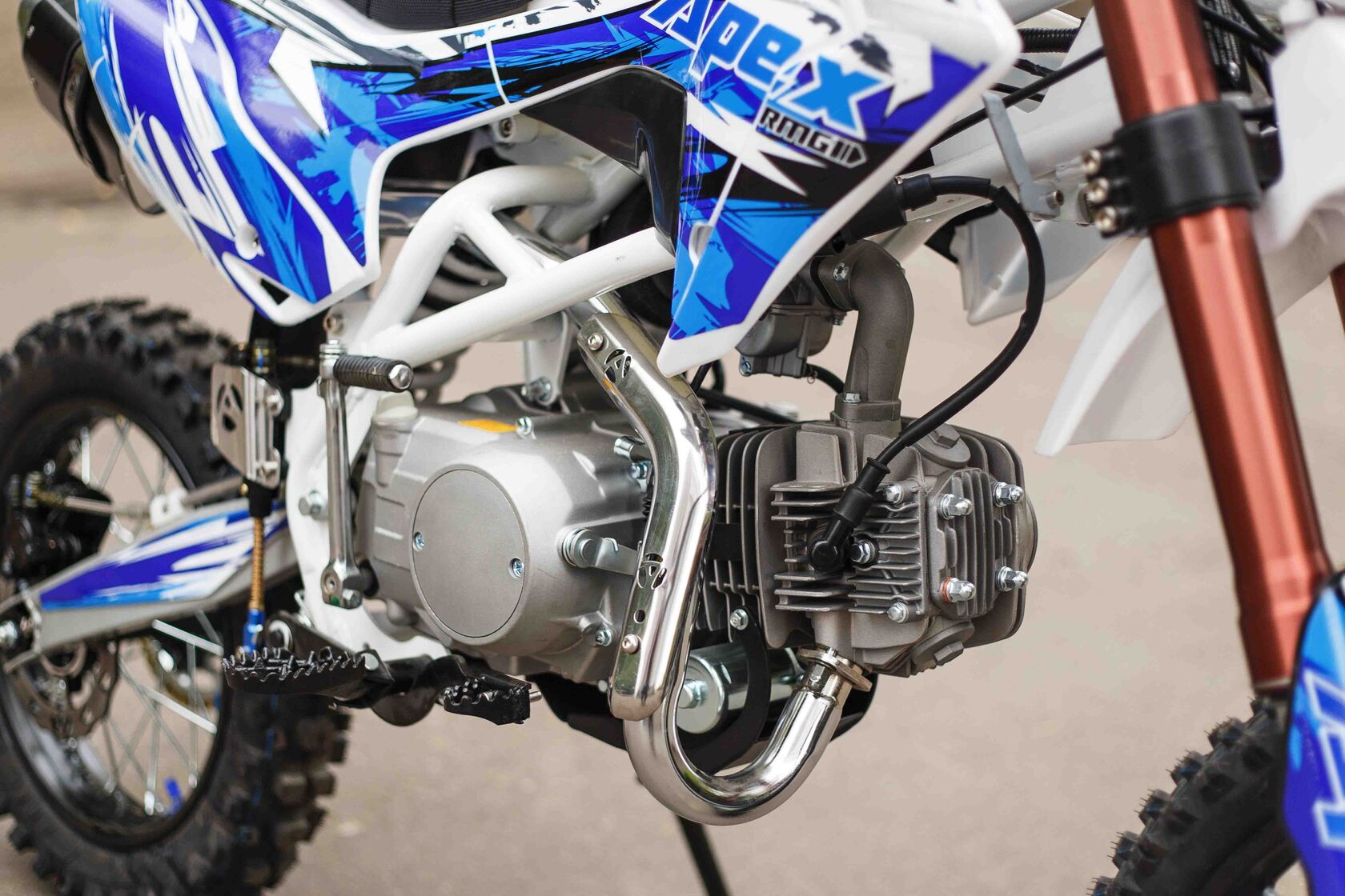 О надёжный питбайк APEX125 идеален для поездок по грунтовым дорогам и бездорожью. Хорошо чувствует себя на мягком и среднем грунте, разгоняется до 90 км/ч. Оснащён CNC траверсами, фарой, алюминиевыми ободами, весит всего 90 кг. Питбайк прост в управлении и не требует специального ухода, подойдёт как новичкам, так и любителям мотокросса.У кроссового мотоцикла APEX125 отличный узнаваемый дизайн. Конструкция подчёркивает неуступчивый спортивный характер питбайка, который не остановится ни перед одним препятствием. Пластик комбинированный, прочный, не ломается при сгибании. Кроссовый мотоцикл APEX125 доступен в красном и синем цвете, при этом в основной цвет окрашен не только пластик, но и обода колёс и другие детали питбайка.Передняя подвеска — телескопическая нерегулируемая вилка перевёрнутого типа, которая отлично подходит для преодоления ям, ухабов и других неровностей плохих дорог или их отсутствия. Задняя подвеска маятниковая с моноамортизатором. Руль 22 мм с высоким подъёмом и перекладиной удобен для мотоциклистов разного роста. Ручки руля — комфортные PRO TAPER. Питбайк оснащён складными рычагами сцепления и переднего тормоза, а также CNC-лапкой переключения передач.Питбайк весит всего 75 кг, при этом выдерживает вес до 150 кг. Оснащён CNC траверсами, рама полудуплексная стальная, мотоцепь качественная. Колёса спицованные, сделаны из прочного и лёгкого алюминия. Размер заднего колеса — 14 дюймов (350 мм), переднего — 17 дюйм (430 мм). Тормоза дисковые, передний тормозной суппорт двухпоршневой, задний — однопоршневой.Питбайк оснащён карбюратором с фильтром нулевого сопротивления VM22 MIKUNI и одноцилиндровым четырёхтактным двигателем с воздушным охлаждением. Надёжный мотор мощностью 9 л. с. и объемом 125 см³ разгоняет кроссовый мотоцикл APEX125 до 90 км/ч. Коробка передач механическая, четырёхступенчатая. Система зажигания электронная (CDI), для запуска двигателя можно использовать кикстартер и электростартер.СверхпроходимостьПокрышки с шипами и высоким грунтозацепом идеальны для бездорожья. Мощность мотора и небольшой вес питбайка позволяют ему преодолевать значительные препятствия и непролазную грязь, хорошо заходить в подъёмы.Для поездок при низкой видимости и в ночное время суток питбайк оснащён фарой, которая включается при повороте замка зажигания (1 – выключить, 2 – включить, 3 – свет). Также в комплекте есть щиток для номера, который ставится вместо фары.Питбайк 125 относится к недорогим моделям, которые при должной эксплуатации работают без сбоев и капризов. Кросс неприхотлив в обслуживании, не занимает много места в гараже. При необходимости в нём легко сменить любую повреждённую деталь. Купить питбайк 125 вы можете в официальном магазине Мотолэнд, здесь же всегда можно приобрести запасные детали и комплектующие, которые стоят недорого и всегда есть в продаже. При покупке питбайка не забудьте о защитной экипировке.