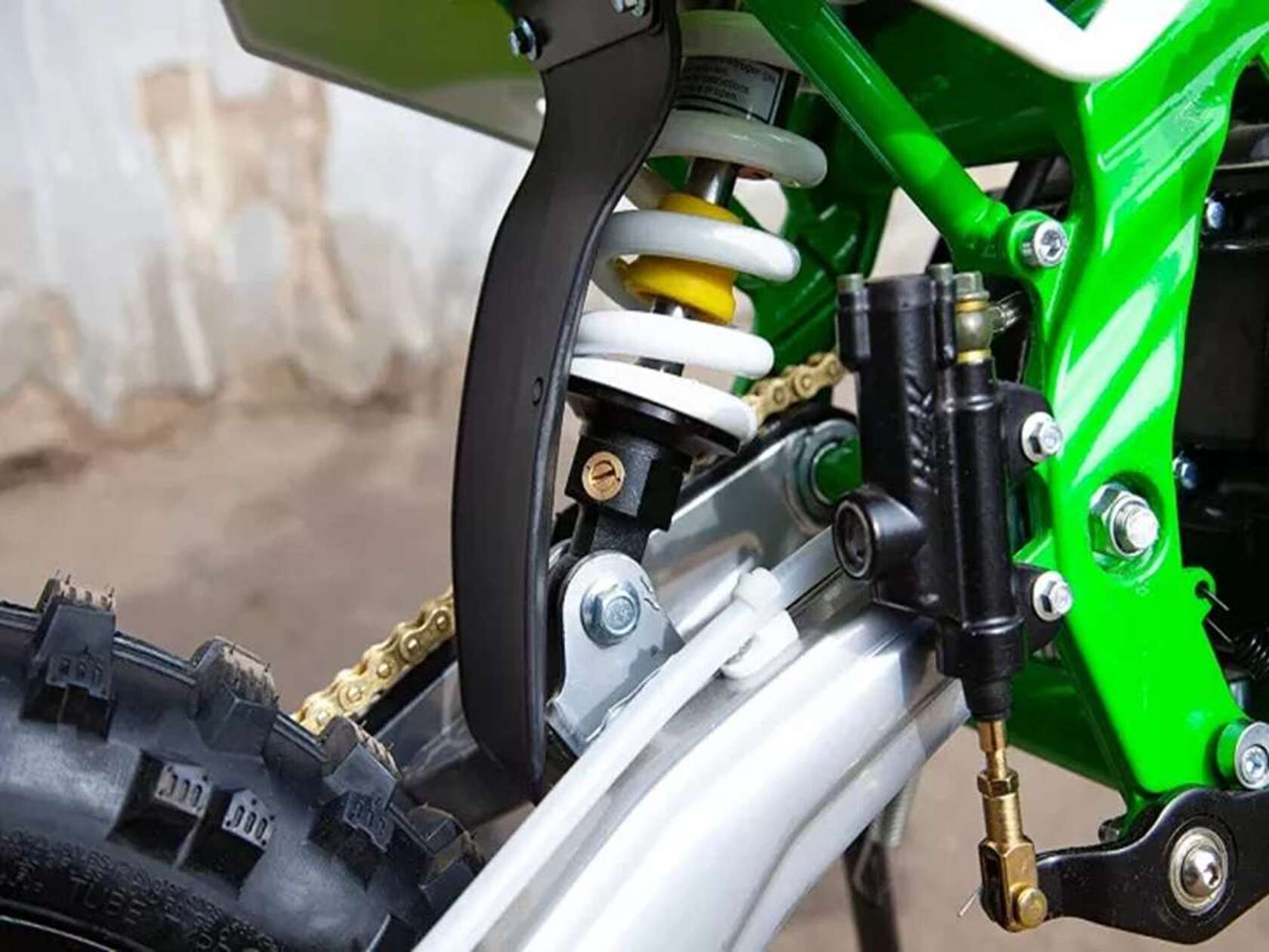 Питбайк BSE MX125 17/14 Racing Green - отличный выбор для тех, кто делает первые шаги в мире спорта, кросса и оффроада. В оригинальной, усиленной, хромомолибденовой раме BSE, устанавливается мощный 4-х тактный двигатель Zonghshen 125 куб см с воздушным охлаждением и 4-ступенчатой коробкой, в рабочем тандеме с спортивным карбюратором MIKUNI VM 22 способный развивать мощность 10 лошадиных сил. Удлиненная колесная база и превосходная подвеска увеличивает курсовую устойчивость питбайка и позволяет райдеру с большим комфортом управлять им на прямых участках трассы и с легкостью проходить "острые" повороты и подъёмы и любые неровности. Мощная тормозная система HSK Racing c армированными тормозными шлангами.Подвеска питбайка базируется на традиционном выборе комплектующих: телескопическая вилка-«перевертыш» впереди и моноамортизатор сзади. Настройки отбоя/сжатия имеются только у заднего амортизатора, работа вилки корректируется заменой масла. MX 125 укомплектован резиной с увеличенным грунтозацепом, фильтрбоксом, короткоходной ручой газа.
