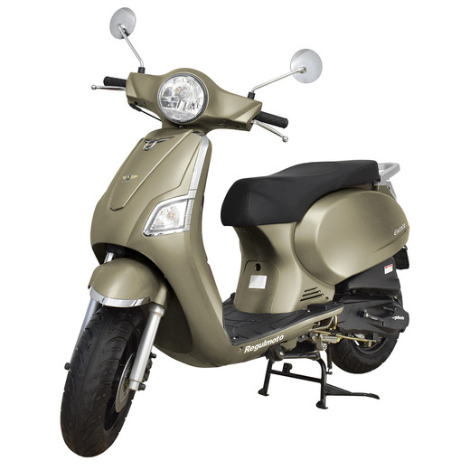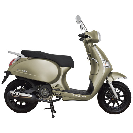 Питбайкмаркет представляет вниманию поклонников утилитарной мототехники скутер Regulmoto Estate 125 (LJ125T-V), который Вы можете приобрести в нашем мотосалоне и интернет-магазине с доставкой до терминала транспортной компании-перевозчика в Вашем регионе.Данная модель скутера производства китайской компании Ningbo Longjia Motorcycle широко известна европейским поклонникам малокубатурной мототехники. Под именем Longjia 125T-V завоевал определенную популярность в Великобритании, Италии, Польше и других странах ЕС. Потребителей привлекают отличный внешний вид скутера, высокое качество компонентов и качественная сборка, доступная цена и невысокая стоимость сервисного обслуживания.Дизайн скутера выполнен в узнаваемом ретро-дизайне, однако множество используемых компонентов мототехники соответствуют актуальным тенденциям мотоиндустрии. Литые колесные диски с 12-дюймовыми широкими покрышками, надежные дисковые тормоза на переднем и заднем колесах, электростартер, подвеска, представленная телескопической вилкой спереди и гидравлическим амортизатором сзади, – все это говорит о большем уровне безопасности и комфорта при повседневном использовании скутера.Скутер Regulmoto Estate 125 оснащается 4-тактным двигателем с воздушным охлаждением. В паре с карбюратором мотор рабочим объемом 124 см3 демонстрирует 8,8 максимальной мощности при 8000 оборотах/мин; максимальная развиваемая скорость составляет 90 км/ч. На скутере реализована автоматическая трансмиссия с ременным вариатором, простая и надежная в эксплуатации конструкция. Дополнительное оборудование представлено полным комплектом светотехники, приборной панелью, зеркалами заднего вида.Легкость управления, надежность и неприхотливость Regulmoto Estate 125 будут на руку, как начинающим, так и опытным водителям. Технические характеристики оборудования и широкие эксплуатационные возможности скутера позволяют ему стать отличным вариантом выбора надежного транспортного средства для ежедневных поездок в черте города и за его пределами.